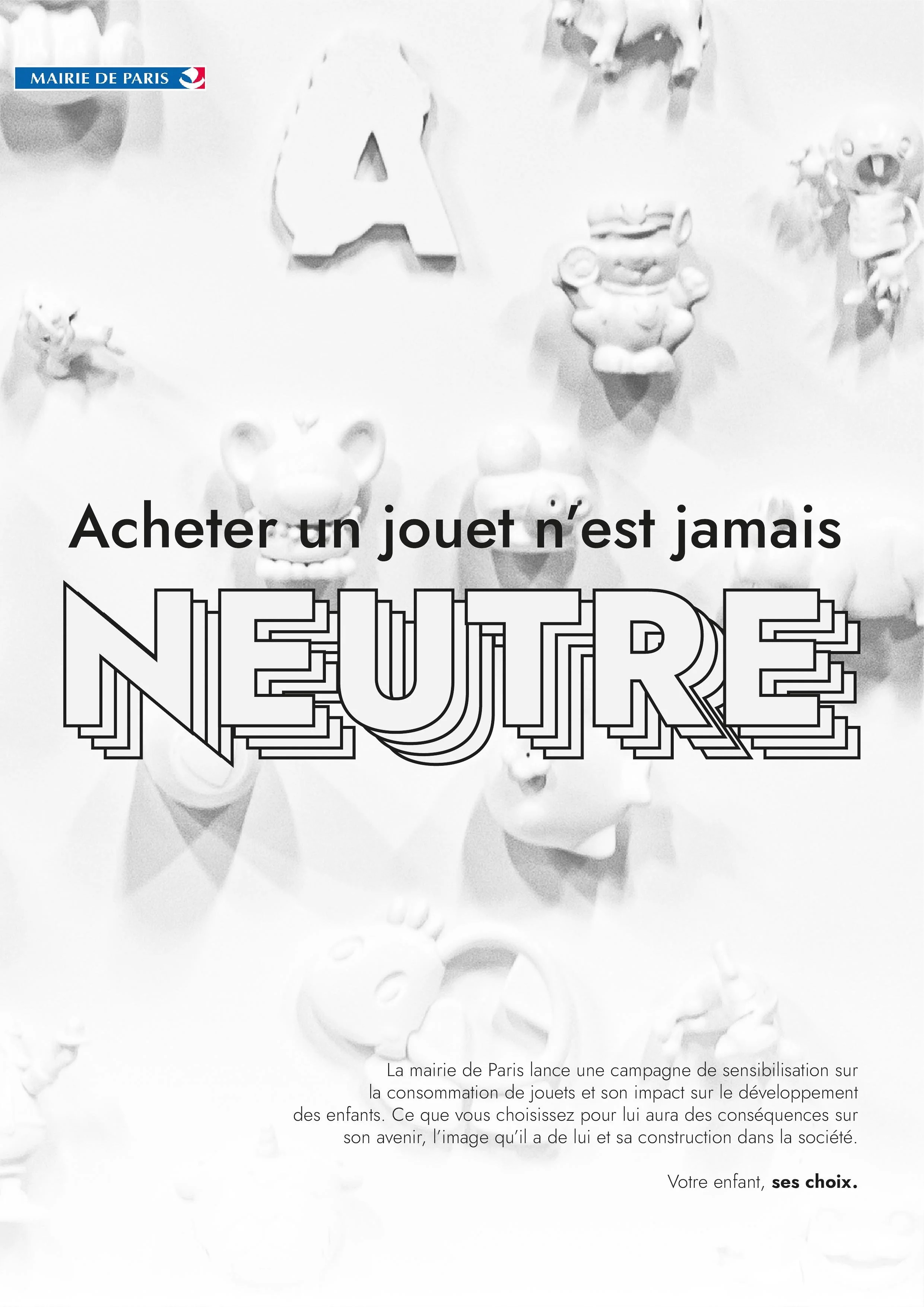 Au cours d’un workshop sur la question du genre et des jouets, mené par L’Atelier Baudelaire, nous avons opté pour le thème du neutre. En récupérant de vieux jouets puis en les peignant entièrement en blanc, afin que les enfant se les réapproprient en dehors du marketing coloré habituel (bleu/rose…).